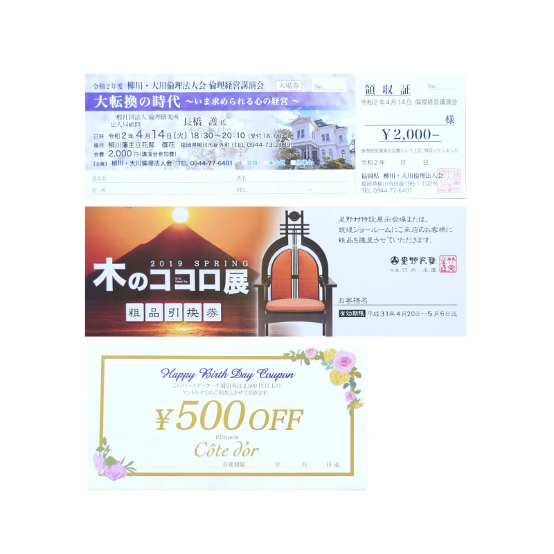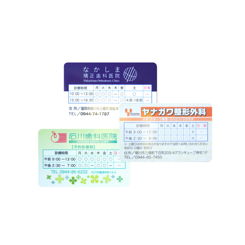 年末にお届けするカレンダーも色々な種類の印刷が対応可能です。紙やPVC(プラスチック)のカードの診察券やミシン目加工の必要なチケットも色々とご相談ください。